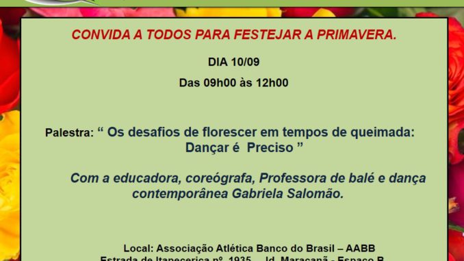 A palestra será com a coreógrafa Gabriela Salomão, com o tema Os desafios de florescer em tempos de queimada: Dançar é Preciso.