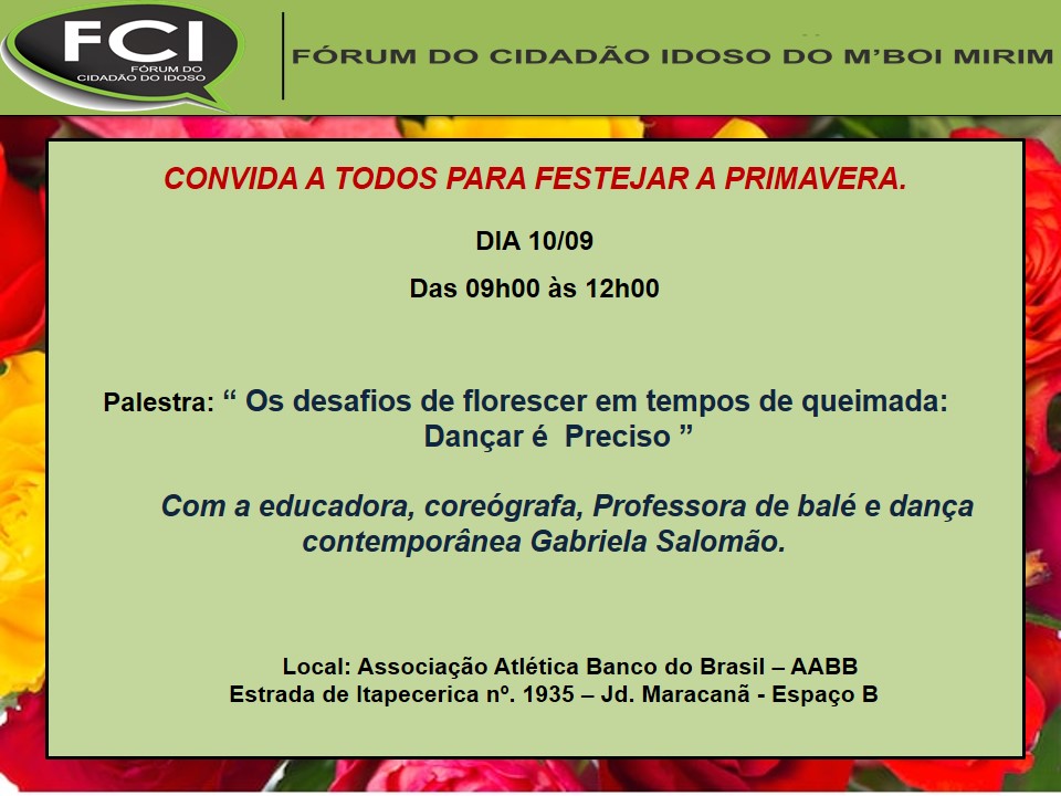 O Fórum do Cidadão Idoso de M´Boi Mirim, na Zona Sul da Capital, em São Paulo, marcou para a próxima terça-feira, dia 10 de setembro de 2019, seu encontro mensal, na Associação Atlética Banco do Brasil-AABB, na Estrada de Itapecerica, 1935, no Jardim Maracanã.