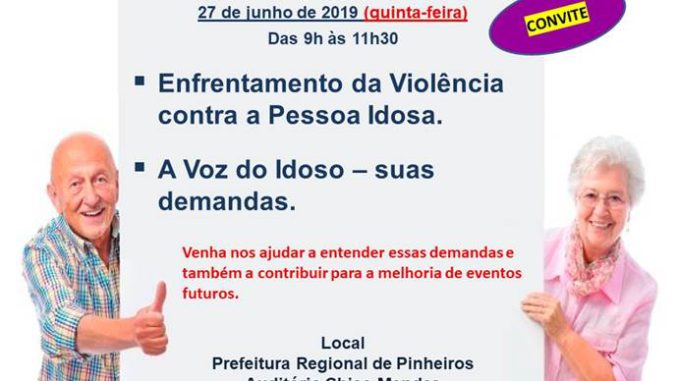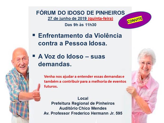 O Fórum do Idoso de Pinheiros, que se reúne mensalmente no auditório da Subprefeitura de Pinheiros para discutir as questões de interesse dos idosos do bairro, da Zona Oeste da Capital, faz hoje das 9 às 12 horas seu encontro de junho.