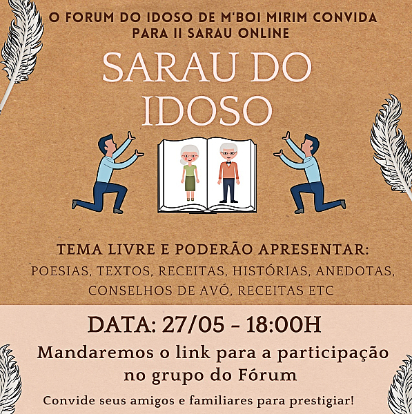Fórum do Idoso do M´Boi Mirim convida para seu 2º Sarau do Idoso online, hoje 27/5 27/05/2021 Hermínia Brandão M´Boi Mirim e Região- Capital SP 0 O Fórum do Cidadão Idoso do M´Boi Mirim, na Zona Sul da Capital, em São Paulo, marcou para hoje, 27 de maio, às 18 horas, seu 2º Sarau do Idoso online, através do Google Meet. Fórum do Idoso do M´Boi Mirim