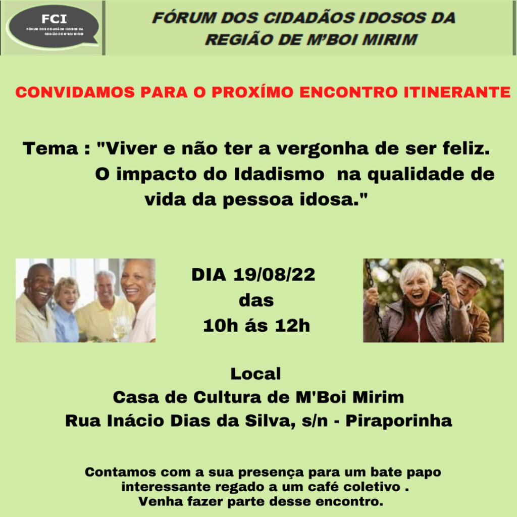 O Fórum dos Cidadãos Idosos do M´Boi Mirim, na Zona Sul da Capital, em São Paulo, está convidando para sua próxima reunião, na sexta-feira 19 de agosto de 2022, de forma presencial.