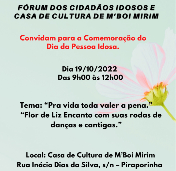 O Fórum dos Cidadãos Idosos do M´Boi Mirim, na Zona Sul da Capital, em São Paulo, vai festejar o Dia Internacional da Pessoa Idosa, no seu encontro de outubro, marcado para a próxima quarta-feira, 19/10.