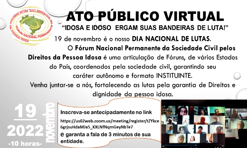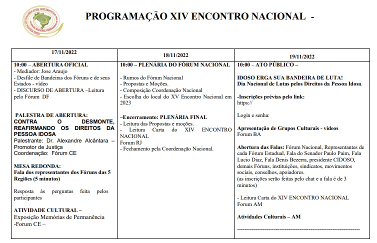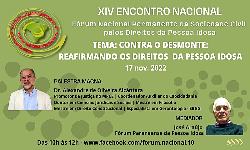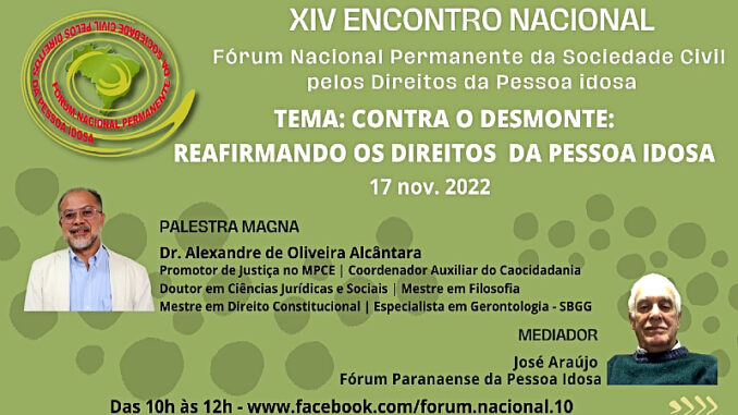 O Fórum Nacional da Sociedade Civil da Pessoa Idosa realiza nesta semana, de 17 a 19 de novembro, o seu 14º Encontro Nacional, virtual, que poderá ser acompanhado por todas as pessoas interessadas pela sua página no Facebook.