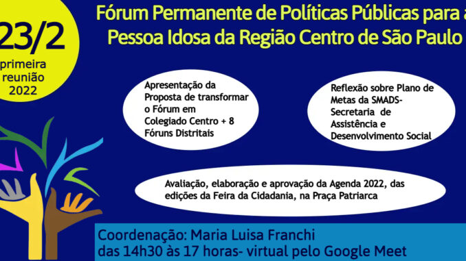 O Fórum Permanente de Políticas Públicas Para Pessoas Idosas da Região Centro, da Capital, em São Paulo, marcou a sua primeira reunião de 2022, para a próxima quarta-feira, 23 de fevereiro, às 14h30.