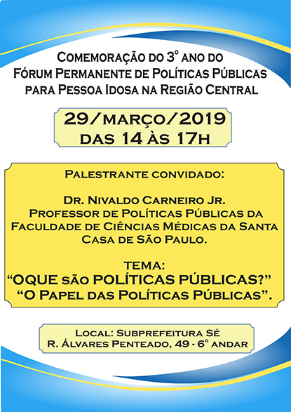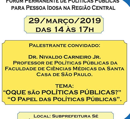 Esses serão os temas da palestra que o Prof. Dr. Nivaldo Carneiro Jr, médico e professor na Santa Casa de São Paulo vai proferir no encontro de comemoração do 3º ano do Fórum Permanente de Políticas Públicas para a Pessoa Idosa na Região Central, na tarde de 29 de março de 2019.