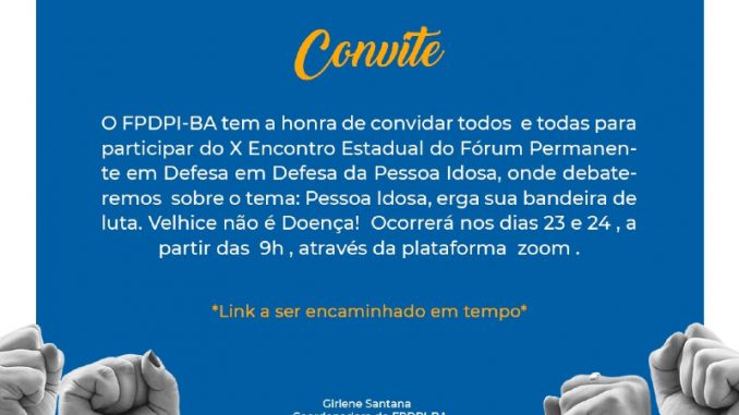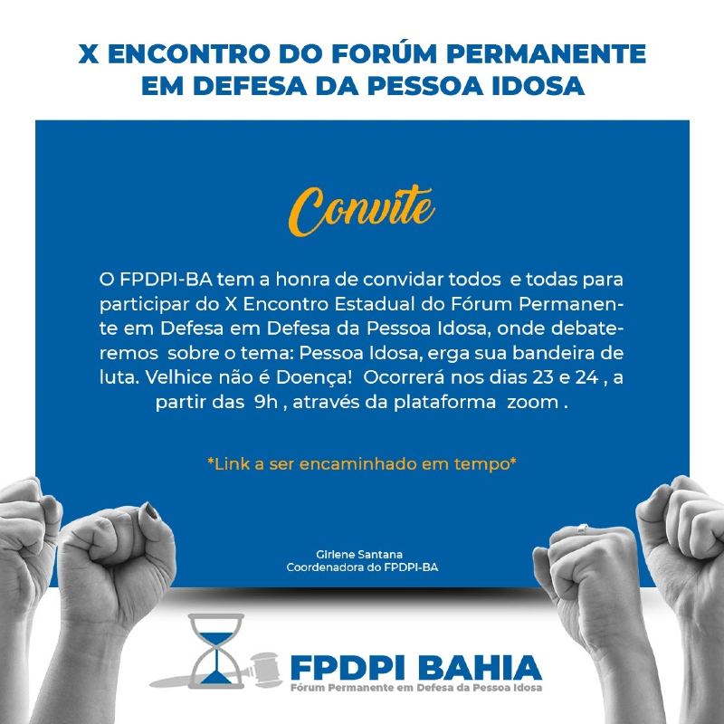 O Fórum Permanente em Defesa da Pessoa Idosa da Bahia vai realizar seu  X Encontro Estadual,  com o tema Pessoa Idosa, erga sua bandeira de luta: Velhice não é doença!, nos dias 23 e 24 de setembro de 2021.