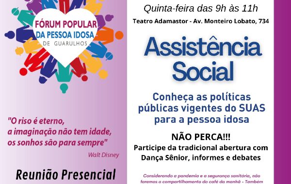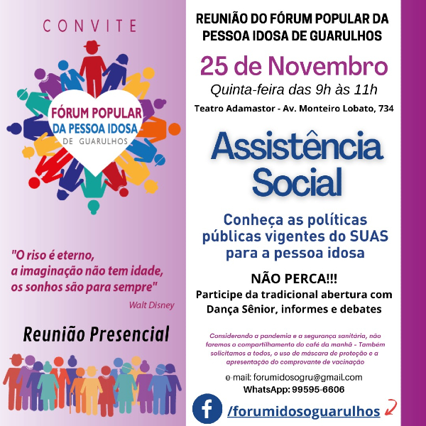 O Fórum Popular da Pessoa Idosa de Guarulhos, na cidade da Grande São Paulo, faz na próxima quinta-feira,  25 de novembro, a partir das 9 horas, no Teatro Adamastor, na Rua Monteiro Lobato nº 734, sua reunião mensal. O encontro será presencial, mas terá também transmissão pelo YouTube.