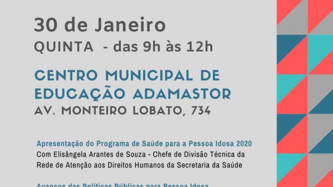 O Fórum Popular da Pessoa Idosa de Guarulhos, cidade da Grande São Paulo, marcou para manhã, da quinta-feira 30 de janeiro, a primeira reunião mensal, de 2020, das 9 horas às 12 horas.