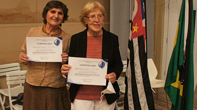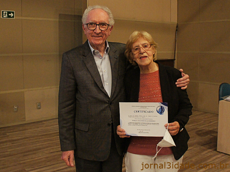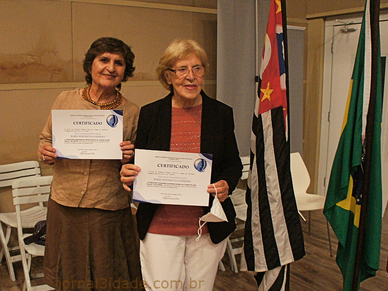 Maria do Carmo Guido recebeu o diploma Reconhecimento Social Maria Antonieta Guerriero representando o Fórum do Butantã. Maria Aparecida Caprino uma das fundadoras do Fórum de Pinheiros. Foto: jornal3idade.com.brMaria do Carmo Guido recebeu o diploma Reconhecimento Social Maria Antonieta Guerriero representando o Fórum da Pessoa Idosa do Butantã. Maria Aparecida Caprino uma das fundadoras do Fórum da Pessoa Idosa de Pinheiros. Foto: jornal3idade.com.br