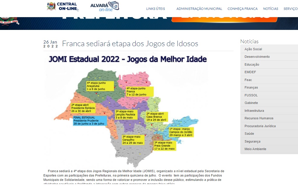 Franca, cidade que fica na região nordeste do Estado de São Paulo, desistiu de sediar a 6ª etapa do JOMI 2022- Jogos Estaduais da Melhor Idade, marcada para se realizar na próxima semana, no período de 7 a 12 de junho.