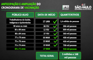 A previsão inicial era começar a vacinar o público de 70 e 71 anos no dia 29. Entretanto, o governo disse que conseguiu antecipar a data e incluir a população de 69 anos.