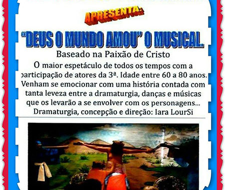 O Grupo de Teatro da 3ª Idade Nova Vida , que há 16 anos se apresenta com atores e atrizes da terceira idade, marcou para o dia 26 de abril, no auditório da Subprefeitura da Vila Prudente, na Zona Leste da Capital, em São Paulo, duas apresentações do espetáculo Deus o Mundo Amou, musical, baseado na Paixão de Cristo.