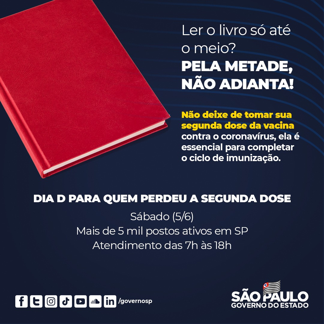 Hoje, 5 de junho, mais de 5 mil postos de saúde estão abertos, desde às 7h, em todo o estado de São Paulo para que as pessoas que já deveriam ter tomado a segunda dose da vacina contra a COVID, completem sua imunização.