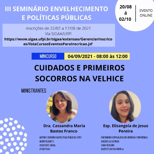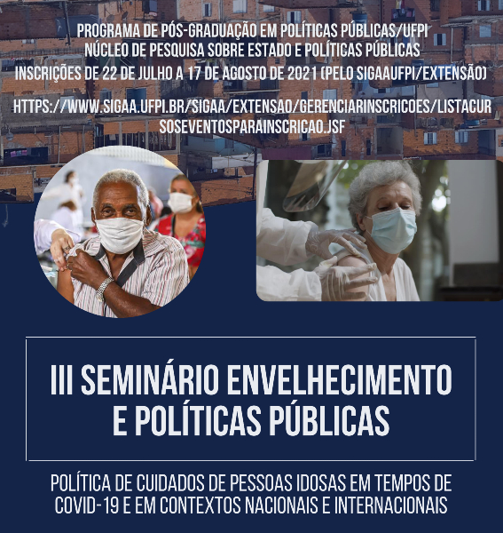 O III Seminário Envelhecimento e Políticas Públicas com o tema “Política de Cuidados de Pessoas Idosas em Tempos de COVID-19 e em Contextos Nacionais e Internacionais” vai se realizar de 20 de agosto a 2 de outubro de 2021, com carga horária de 42h.
