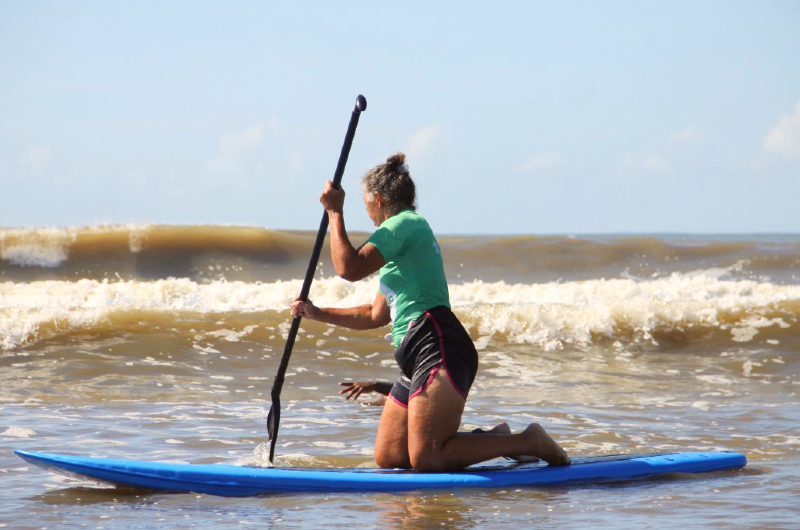 Ilha Comprida, SP, proporcionou aulas de Stand-Up no mar, para idosos 70+