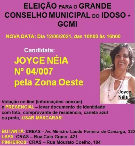 Joyce Néia, de 62 anos, é candidata para ser conselheira do GCMI – Grande Conselho Municipal do Idoso de São Paulo, como representante da Zona Oeste. Seu número é 04/007.