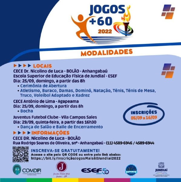 Jundiaí fará de 25 a 29 de setembro os Jogos 60+ com 12 modalidades 19/09/2022 Hermínia Brandão Atividade Física, Campinas e Região, Jundiaí SP 0 A Prefeitura de Jundiaí promove no próximo domingo, 25 de setembro, a abertura oficial dos Jogos 60+, que irão se realizar até dia 29/9. Serão 12 modalidades disputadas, divididas em: atletismo, bocha, buraco, damas, dominó, dança de salão, natação, tênis, tênis de mesa, truco, vôlei adaptado e xadrez. Quase todas terão como palco o ginásio do CECE Dr. Nicolino de Luca (Bolão), no Anhangabaú e ESEF. As disputas da Bocha serão no CECE Antônio de Lima, no bairro da Agapeama. Os concursos de Miss e Mister e a Dança de Salão, assim como o baile de encerramento, estarão no Clube Juventus, no bairro Vila Campos Sales. Jogos 60+ de Jundiaí SPJundiaí SP
