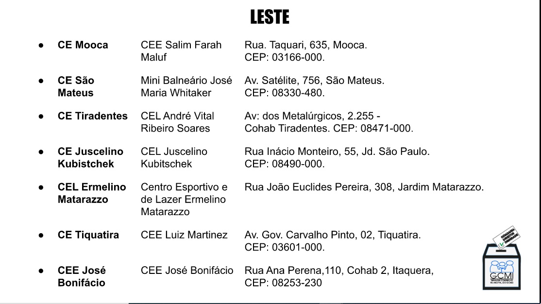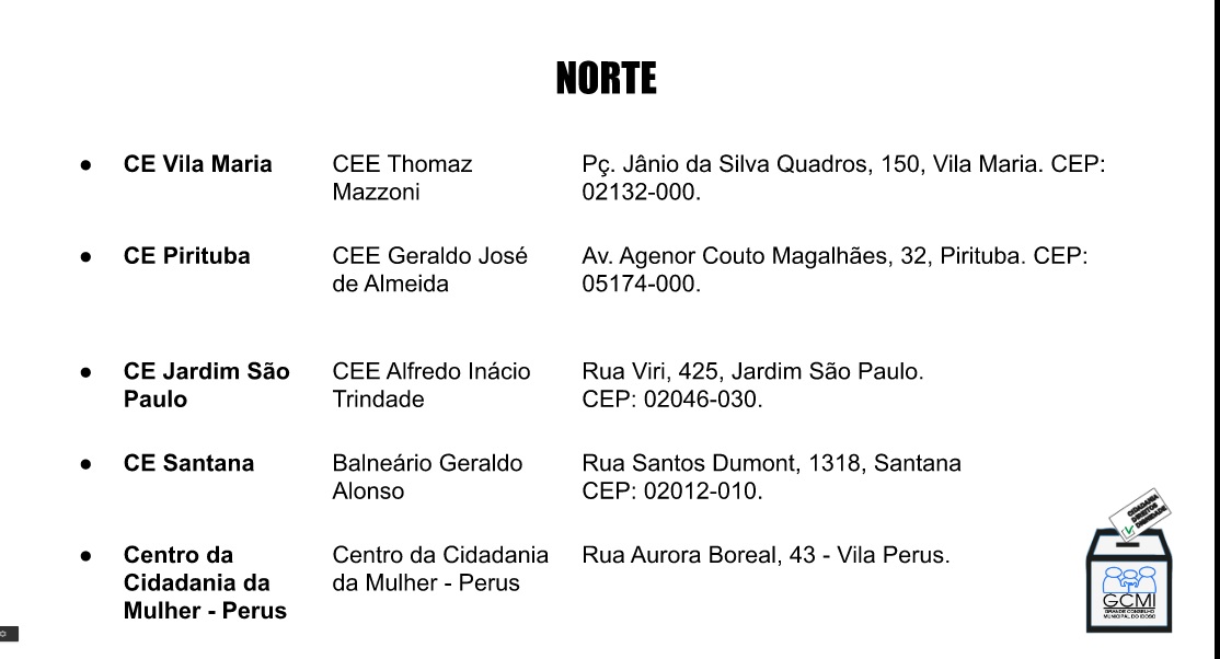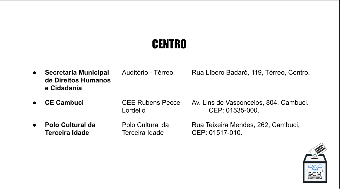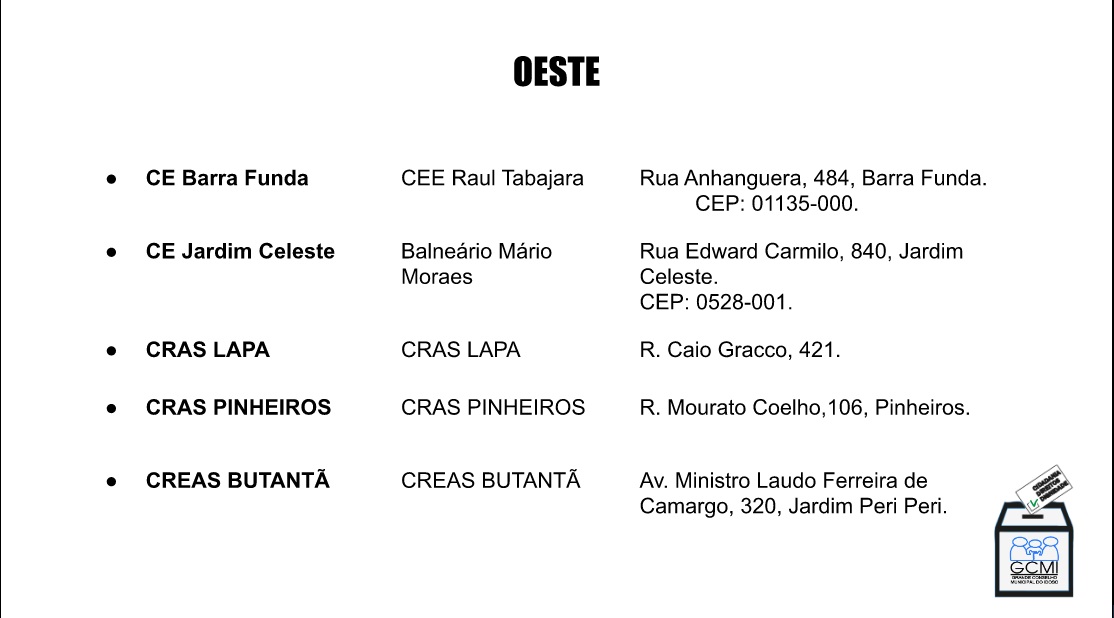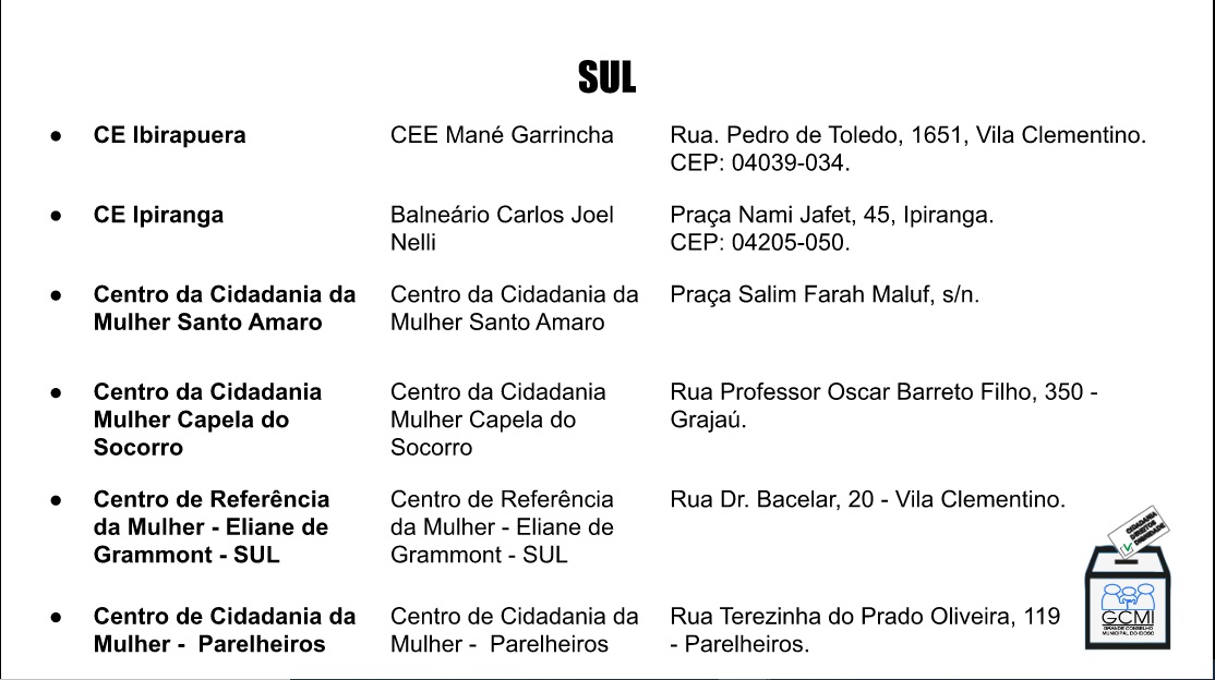 Locais de Votação Presencial para Eleição 2020 do GCMI para conselheiros e conselheiras 23/11/2020 Hermínia Brandão CONSELHO MUNICIPAL DO IDOSO DE SP, CONSELHOS E FÓRUNS DE IDOSOS SP 0 Votação na Zona Norte Votação na Zona Sul Votação na Zona Leste Votação na Zona Oeste Votação na Zona Centro GCMIGCMI Eleições 2020GCMI- Grande Conselho Municipal do Idoso de São Paulo