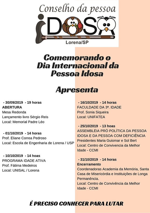 O Conselho Municipal da Pessoa Idosa da cidade de Lorena, no Interior de São Paulo, na Região do Vale do Paraíba, presidido por Maria Guiomar Munhoz Leite Do Couto, organizou várias atividades durante todo o mês de outubro, em comemoração ao Dia Internacional do Idoso.