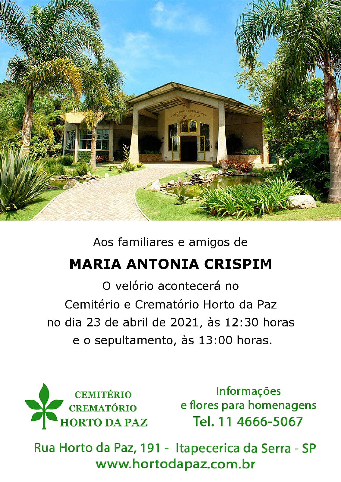 É com pesar que o Jornal da 3ª Idade noticia o falecimento de Maria Antônia Crispim, aos 95 anos, infelizmente mais uma vítima da COVID-19.