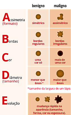 Dr. Fernando C. M. Amato, cirurgião plástico- Existe uma regra básica que é o ABCDE: o A corresponde a assimetria, quando uma pinta com alteração no formato; B nas bordas; C quando tem alteração de cor; D quando devemos observar o diâmetro está maior que 5 mm e o E é aquela pinta que começa a mudar. Também existem aquelas feridas que parecem uma espinha, mas nunca saram. Aquele ferida que sai a casca e não fecha. Isso ajuda a direcionar o diagnóstico.