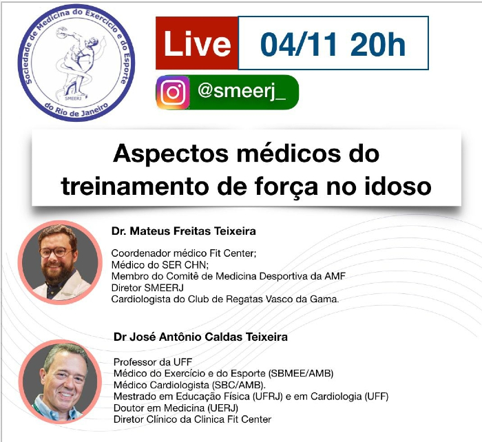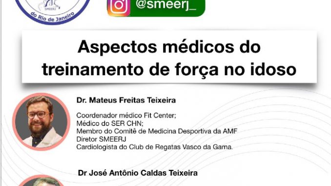 A Sociedade de Medicina do Exercício e do Esporte do Rio de Janeiro (SMEERJ) promove hoje, 4/11, uma debate virtual sobre os “Aspectos Médicos do treinamento e força no idoso”, em sua página no Instagram, a partir das 20 horas. O debate será gratuito e aberto ao público, com transmissão ao vivo.