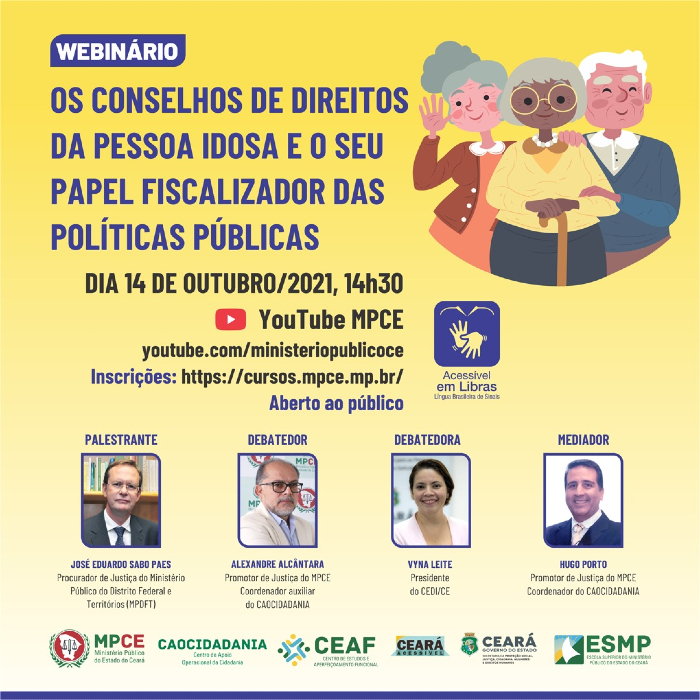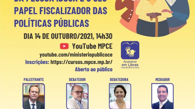 O evento, realizado em alusão ao Dia da Pessoa Idosa, comemorado em 1º de outubro, é aberto ao público e será transmitido pelo canal do MPCE no Youtube, com acessibilidade em libras e dará direito ao certificado aos que se inscreverem previamente pela Plataforma de Cursos da ESMP/CEAF.