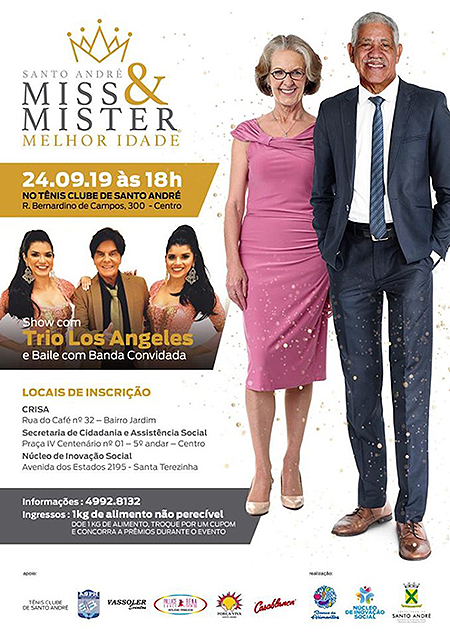 O Concurso de Miss e Mister Melhor Idade de Santo André 2019 está com as inscrições abertas até o dia 13 de setembro, no Crisa, na Secretaria de Cidadania e Assistência Social ou no Núcleo de Inovação Social. Para participar é preciso ter mais de 60 anos, apresentar uma foto de corpo inteiro, cópia do CPF, CNH ou RG e comprovante de residência.