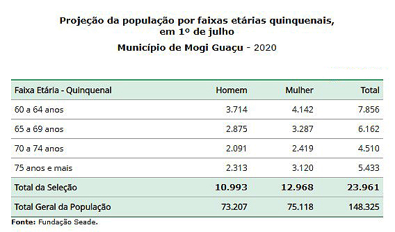 Mogi Guaçu, segundo o Sistema de Projeções Populacionais da Fundação Seade, deverá chegar em 1º de julho de 2020 com uma população de cerca de 24 mil idosos para uma população total de 148 mil habitantes, mais de 16% da população só de cidadãos mais velhos.