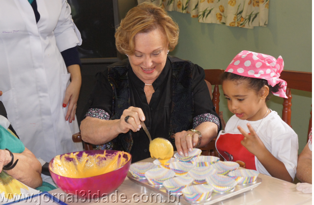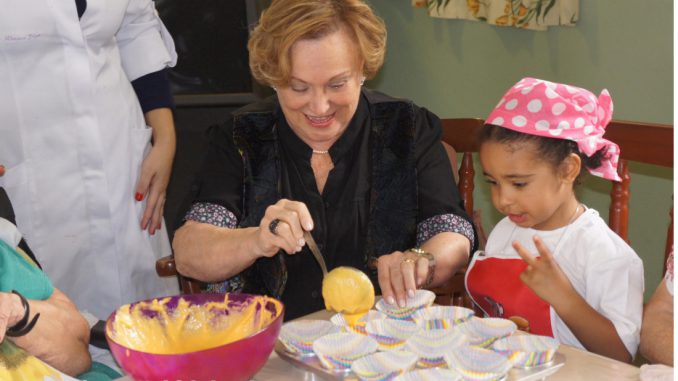A atriz Nice Bruno ajudando uma criança a fazer seu bolinho,  num encontro intergeracional promovido pela ONG Liga Solidária do Butantã, na Zona Oeste de São Paulo, em julho de 2012, quando se comemorava o Dia dos Avós. Foto: jornal3idade.com.br