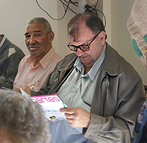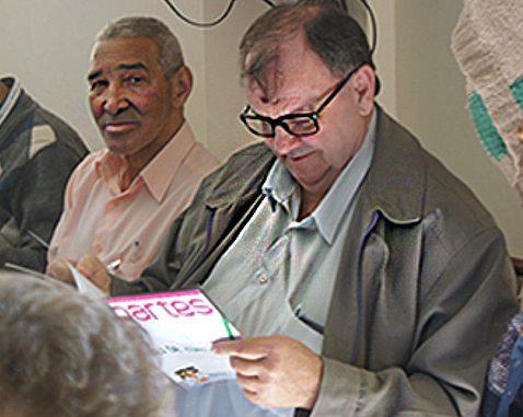 Senhor Marino Cardoso ( olhando de frente) ao lado do Padre Ticão, no dia do Fórum de Ermelino Matarazzo realizado realizado na Casa Tereza Bugolim, em agosto de 2016. Foto: Jornal da 3ª IdadeMarino Cardoso (olhando de frente) ao lado do Padre Ticão, no Fórum de Ermelino Matarazzo realizado na Casa Tereza Bugolim, em agosto de 2016. Foto: Jornal da 3ª Idade