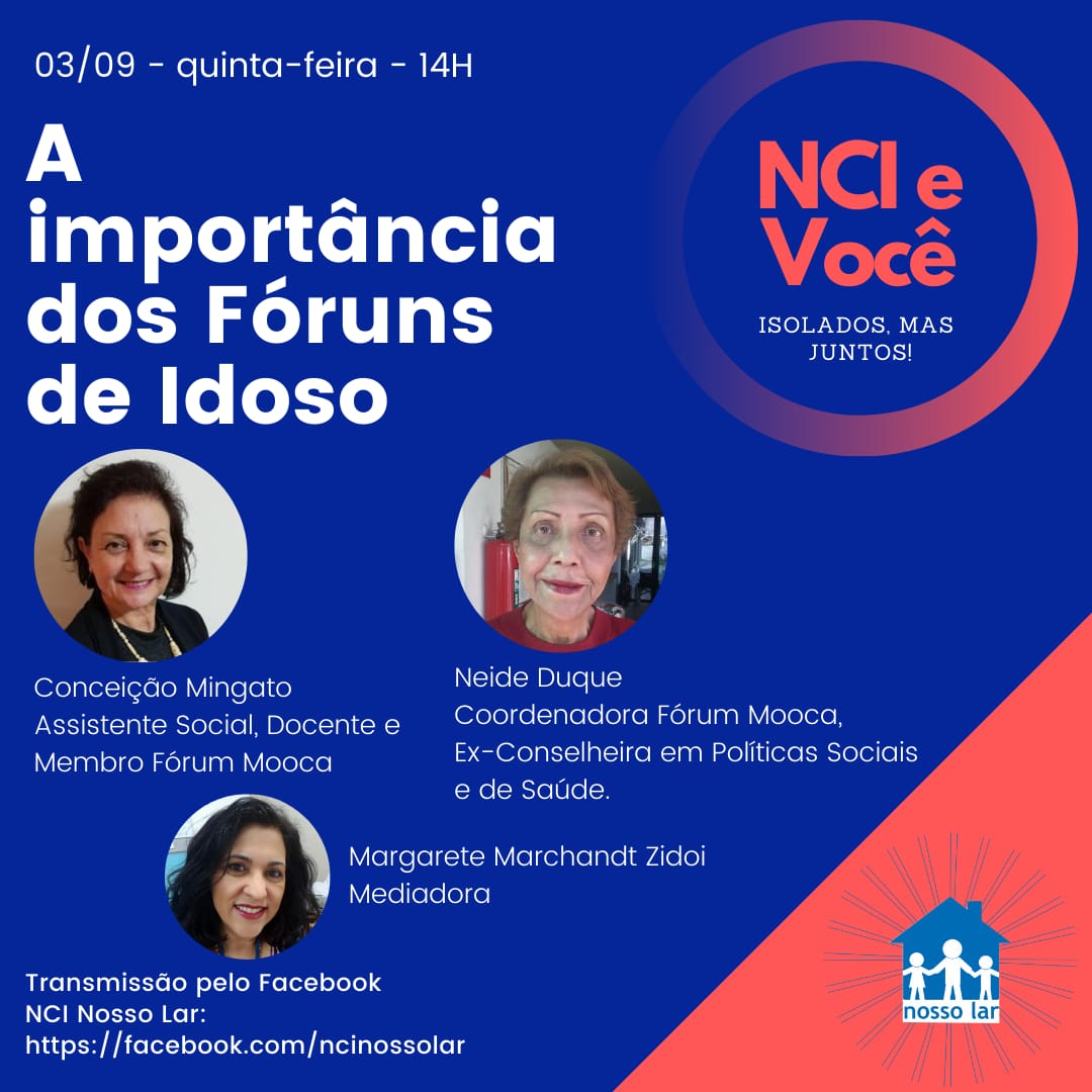 A importância dos Fóruns de Idosos é o tema do encontro virtual promovido pelo NCI- Núcleo de Convivência do Idoso Nosso Lar, hoje, quinta-feira, 3 de agosto de 2020, a partir das 14 horas, na sua página no Facebook.
