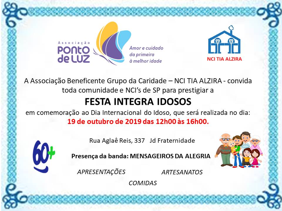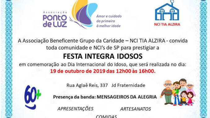 O NCI- Núcleo de Convivência do Idoso Tia Alzira, no Capão Redondo, que é gerenciado por Adriana Carminati, através do cconvênio com a ONG Grupo da Caridade, vai festejar o Dia do Idoso no próximo sábado, 19 de outubro, com a presença de frequentadores de vários outros NCI da região.