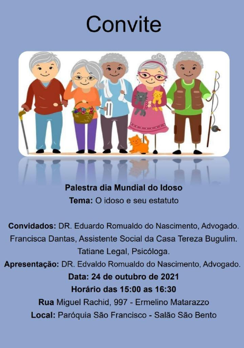 A Paróquia São Francisco de Assis, de Ermelino Matarazzo, na Zona Leste de São Paulo, vai comemorar o Dia Mundial do Idoso, celebrado em 1º de outubro, com uma mesa de debate sobre O Idoso e seu Estatuto, no dia 24 de outubro, às 15 horas.