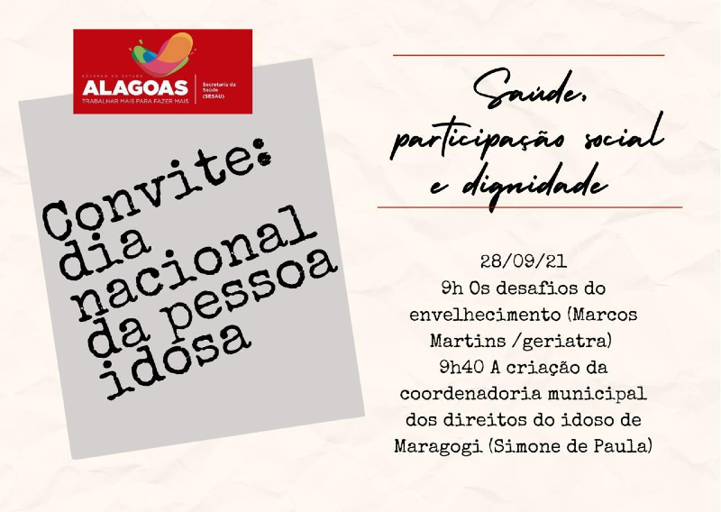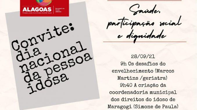 As comemorações do Dia Nacional da Pessoa Idosa, em Alagoas estão programadas com duas webconferências, com o tema geral Participação Social e Dignidade, Envelhecimento sem preconceito é cuidar do nosso futuro.