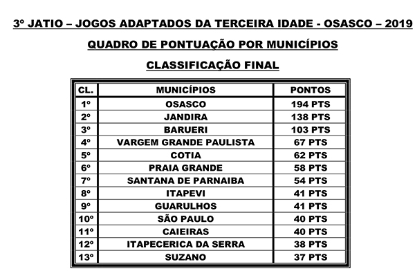 Osasco, Jandira e Barueri foram as cidades vencedoras do 3º JATIO–Jogos Adaptados da Terceira Idade de Osasco, realizados no período de 21 a 25 de outubro de 2019.