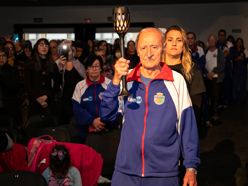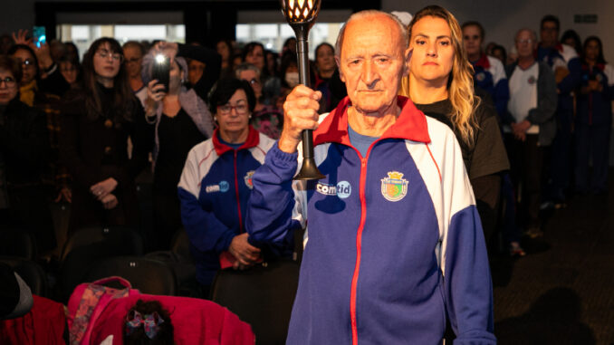 Um dos condutores da tocha olímpica, na cerimônia de abertura do 1º Jotiscs-Jogos da Terceira Idade de São Caetano do Sul, foi Pedro Pioli, de 82 anos, campeão no atletismo que em 2022 representou a cidade em vários torneios.