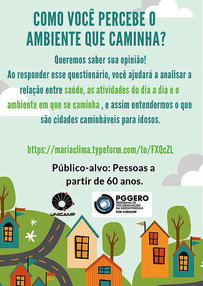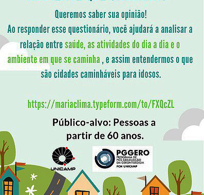 O estudo Caminhabilidade e espaços de vida de idosos: a relação entre saúde, funcionalidade e atributos do ambiente, do Programa de Pós Graduação em Gerontologia da UNICAMP, que tem como objetivo estudar e analisar a relação entre a saúde e as atividades que a pessoa faz no dia a dia e no ambiente de caminhada. Para participar, basta clicar no link através do smartphone, da tablet, do computador ou notebook e seguir as etapas.