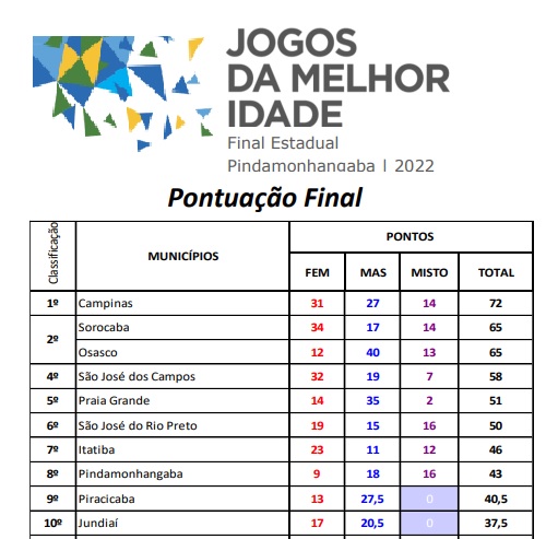 Os Jogos Estaduais da Melhor Idade de SP 2022 (JOMI) terminaram na última quarta-feira, 13 de julho, na cidade de Pindamonhangaba, a 150 km da Capital. As cidades de Campinas, Sorocaba e Osasco foram as campeãs.