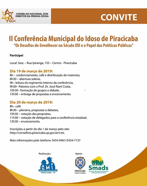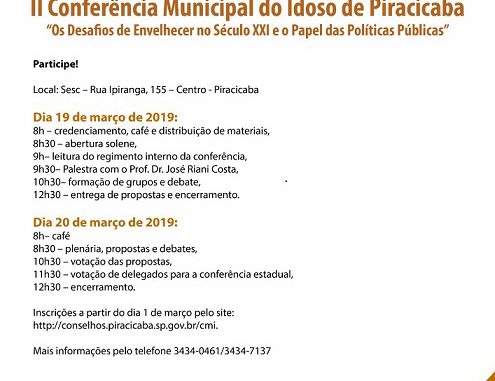 Piracicaba, a noroeste da capital do Estado de São Paulo vai realizar a sua 2ª Conferência Municipal dos Direitos da Pessoa Idosa em duas manhãs, nos dias 19 e 20 de março de 2019, nas dependencias do SESC, na Avenida Ipiranga, 155.