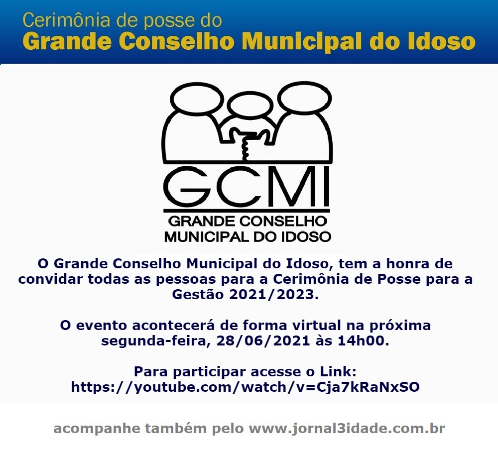 O GCMI- Grande Conselho Municipal do Idoso vai realizar na próxima segunda-feira, 28 de junho de 2021, às 14 horas, a cerimônia de posse para os conselheiros que serão responsáveis pela gestão do biênio que vai de junho de 2021 a junho de 2023.