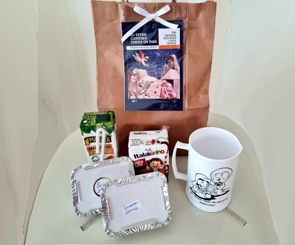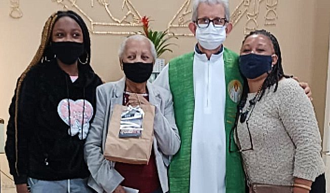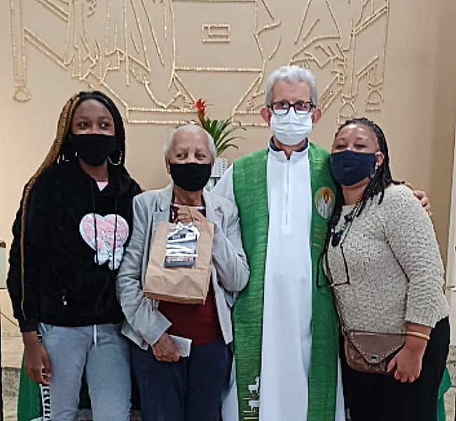 Elza Augusto Batista, de 85 anos, acompanhada pela neta Maria Fernanda Batista e a filha Rita Batista, recebeu do Padre Raimundo Pauletti a sacolinha do Dia dos Avós. Foto: divulgaçãoElza Augusto Batista, de 85 anos, acompanhada pela neta Maria Fernanda Batista e a filha Rita Batista, recebeu do Padre Raimundo Pauletti a sacolinha do Dia dos Avós. Foto: divulgação