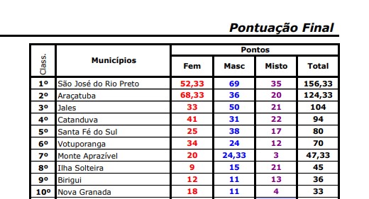 São José do Rio Preto em 1º lugar totalizou 156,33 pontos, a cidade de Araçatuba ficou em 2º lugar com 124,33 pontos e Jales em terceiro lugar totalizou 104 pontos.