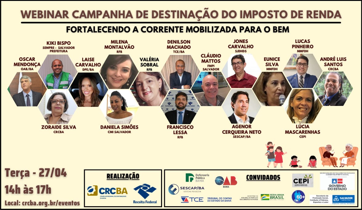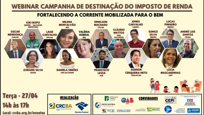 A Receita Federal na Bahia, em conjunto com o Conselho Regional de Contabilidade da Bahia e colaboração de vários profissionais, realiza hoje (27/4), das 14 às 17 horas, o evento Fortalecendo a corrente mobilizada para o bem, para esclarecer como as pessoas e empresas podem destinar valores devidos ao Imposto de Renda para fundos dos Idosos. Link