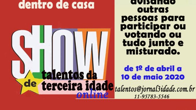 O Jornal da 3ª Idade com o propósito de colaborar com o necessário e imprescindível isolamento das pessoas, principalmente dos idosos, está promovendo de 1º de abril a 10 de maio um concurso “Show de Talentos da Terceira Idade online”.