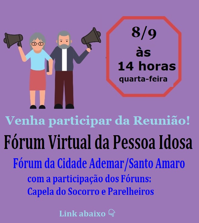 Reunião de setembro do Fórum da Pessoa Idosa de Cidade Ademar e Pedreira será em 8/9 06/09/2021 Hermínia Brandão Capela do Socorro e Região - Capital SP, Cidade Ademar e Região - Capital SP, Parelheiros e Região- Capital SP 0 O Fórum da Pessoa Idosa de Cidade Ademar e Pedreira, da Zona Sul da Capital, em São Paulo, fará a sua reunião de setembro de 2021, na quarta-feira 8/9, às 14 horas. Na véspera será publicado o link. Fórum da Pessoa Idosa de Cidade Ademar e Pedreira