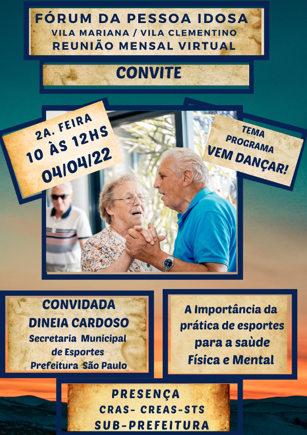 Reunião do Fórum da Pessoa Idosa da Vila Mariana, SP, é hoje, 4/4 no formato virtual 01/04/2022 Hermínia Brandão Vila Mariana e Região- Capital SP 0 O Fórum da Pessoa Idosa da Vila Mariana e Vila Clementino, da Zona Sul da Capital, em São Paulo, faz hoje, segunda-feira, 4 de abril, mais uma reunião virtual, às 10 horas, no formato virtual. O link estará aberto para quem quiser participar: https://meet.google.com/yox-kseg-djb?pli=1 Fórum Vila MarianaVila Mariana e Região
