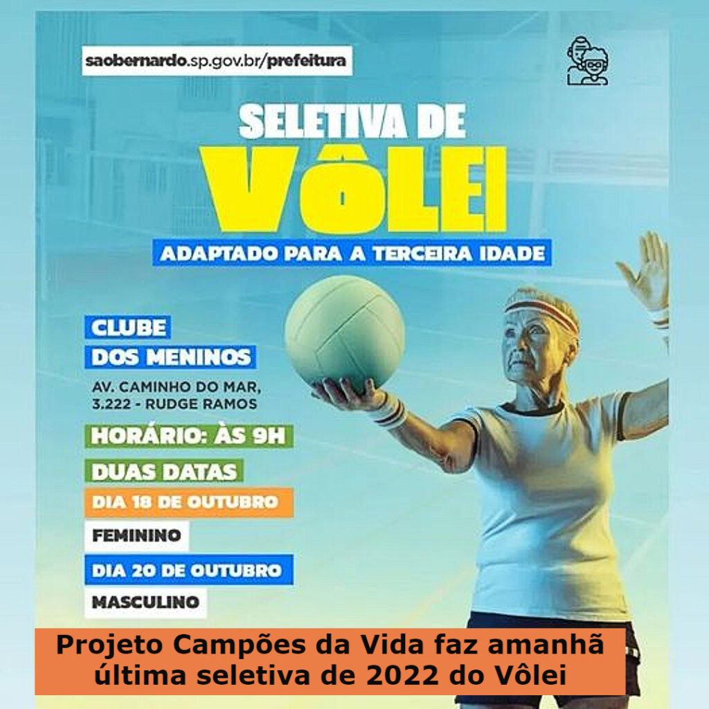 O projeto Campeões da Vida, da Secretaria Municipal de Esportes de São Bernardo Campo, na Grande SP, faz amanhã a última seletiva do ano, do voleibol adaptado da terceira idade, no Clube dos Meninos, na Av. Caminho do Mar, 3222 em Rudge Ramos.