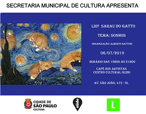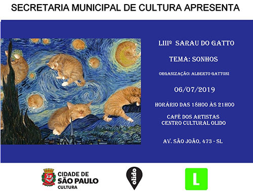 O Sarau do Gatto, o evento mensal e gratuito que proporciona a oportunidade de ler e ouvir muitas histórias, poesias e músicas, no Café dos Artistas, no Centro Cultural Olido, da Secretaria Municipal de Cultura, na Capital, em São Paulo, faz seu próximo encontro na noite de 6 de julho, das 18 horas às 21 horas.
