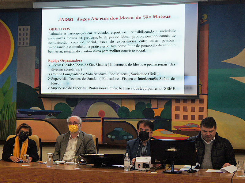 Compondo a mesa para debater a organização do JOMI Paulistano estavam: o Vereador Eli Corrêa; o Secretário Municipal de Esportes, Carlos Augusto Vianna; Dineia Cardoso, coordenadora do Programa Melhor Idade da SEME; o coordenador de Políticas Para a Pessoa Idosa da SMDHC (Secretaria Municipal de Direitos Humanos e Cidadania), Renato Souza Cintra; a interlocutora da Saúde do Idoso em São Mateus, Vera Lúcia Mariano da Silva e a Professora Glicia Maria Bellemo, da Secretaria Estadual de Esportes, que acompanha o Jogos Estaduais, há 24 anos e que participou de forma online.